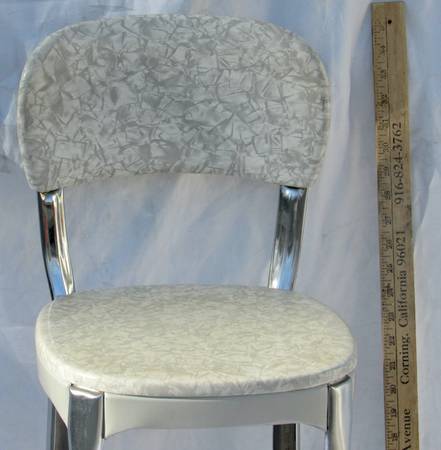 This Vintage Chrome Kitchen with the Unique Grey White Splatter Vinyl seat and back was made by Costco in the 1950’s and it is in very good vintage condition. It is 35” tall at the top back of the seat back, and the seat is 12” wide and approx.13” deep.