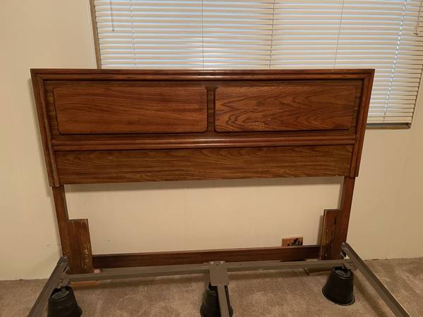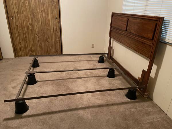 Nice sturdy Queen Size Bedframe, with middle support rail and legs, with Wooden Headboard. Please Text or Call