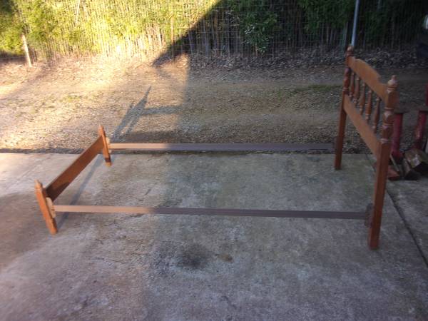 TWIN BED FRAME WOOD ENDS WITH METAL RAILS, USED NO MATTRESS. ASKING $20.00 O.B.O..