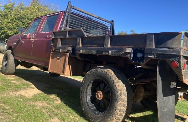 1988 Ford F350. Crew cab. 7.3L idi Diesel. 4x4. 5-speed Manual transmission. 8'x6'8" Cadet flatbed with 2-5/16" gooseneck ball. 170" wheelbase. BW1356 transfer case. Sterling rear with 3.55 gears. High pinion Dana 60 King-Pin front axle. BFG 275/70r18 E tires in decent shape. Newer dodge seats, front and back. 31,473 miles on odometer.